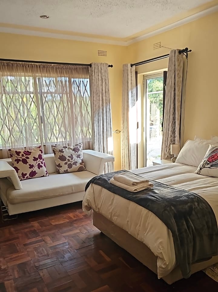 Cosy executive 1 bedroom flat, queen size bed 2 sharing, connecting door from lounge with sofabed for 1 person. Smart kitchenette, fridge, microwave, refurbished shower/bathroom. Remote office desk & chair, full wifi, solar power with backup, water, DSTV and security. Laundry service available. Access to lovely mature garden, parking, verandah, and peaceful surroundings. Separate entrance from main house. 10 minutes walk from Borrowdale Village, shops, banks, restaurants, entertainments.