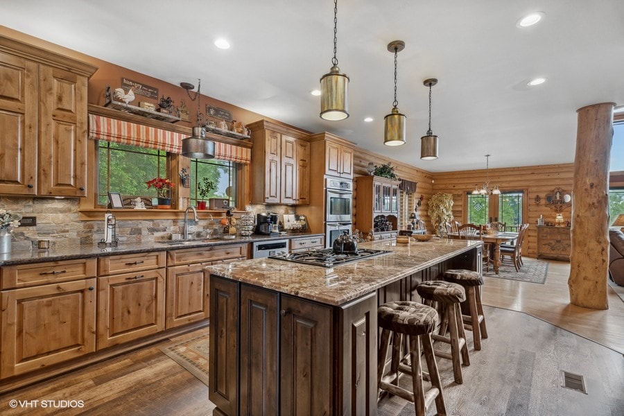 WELCOME TO WATERFRONT LOG-SIDED HOME! ARTISAN CRAFTMANSHIP HOME OFFERS A BACKYARD OASIS SITUATED , NESTLED ON A PRIVATE POND, Heated POOL(closed till April 1st), Hot tub open from Oct 15th to Apr 15thGAZEBO, FIRE PIT, FISHING! 4 BEDROOMS AND 4.5 BATHS The homes sits on the highest point in the neighborhood and has stunning views in the front & backyard! Enjoy the mornings sitting on your front porch. The main floor is completed by an office, finished walkout basement in with a custom built bar