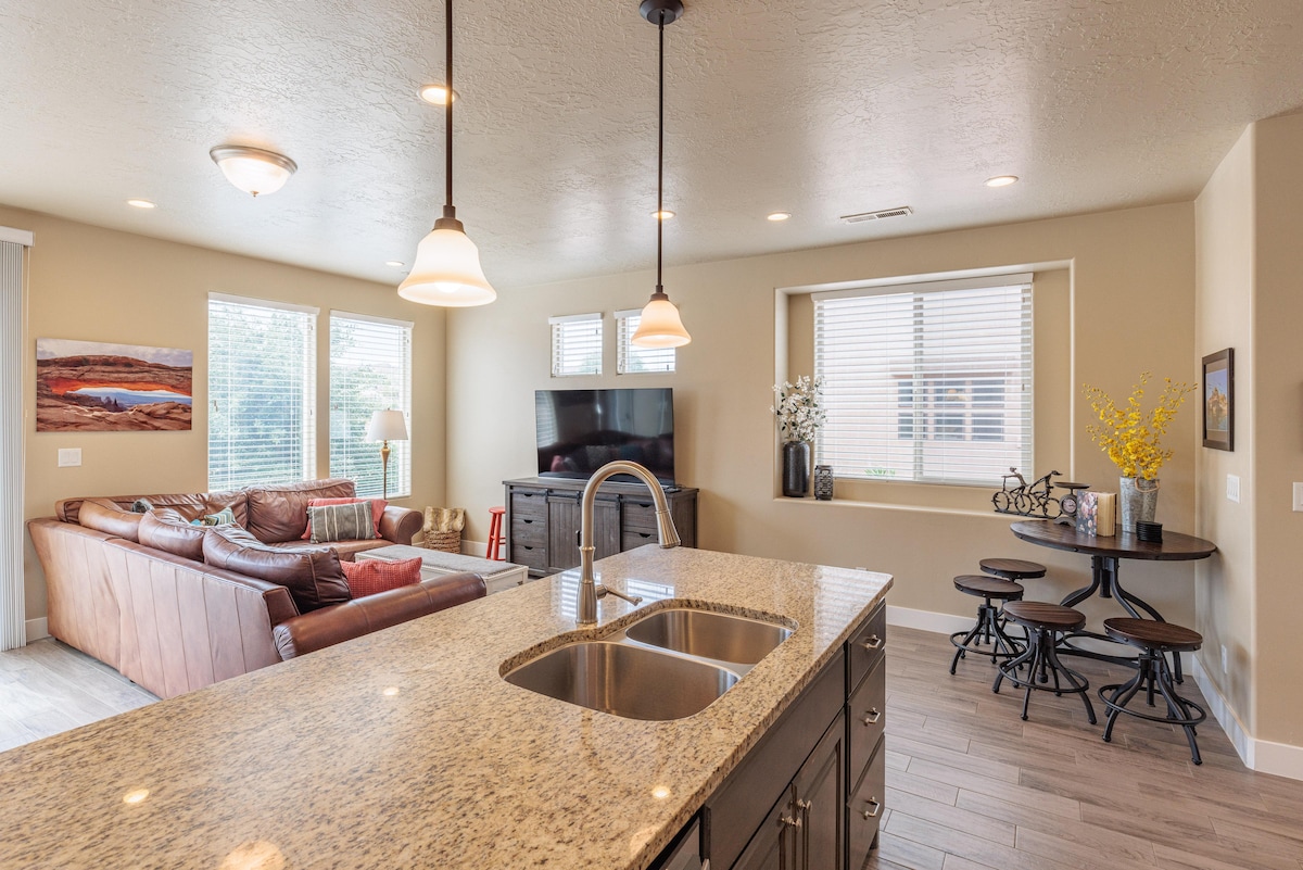 This stylish studio with High-Speed WiFi, Private Entrance, King Bed with Luxury Linens, Large Bathroom with Jetted Tub/Shower, Full Kitchen, Smart Roku TVs, and Fenced Patio with BBQ. Resort includes TWO Pools (Adult & Family), Hot Tub, Pickle Ball Courts, Fitness Center, Laundry Room, Ice Machine, and Spa. Everything NEW! Perfectly located but also very quiet. Best kept secret in St George with everything you would want for an upscale getaway! Book Today *NEW listing discount*