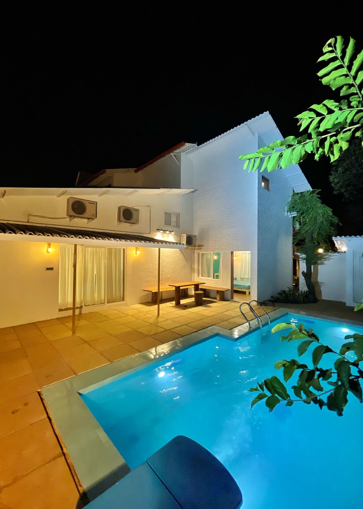 Beautiful quaint French style villa within a quiet secluded with private access gates. Antique furnishings, high ceilings, two poster beds accentuate the old world charm, whilst also contrasting the starkly modern bathrooms with luxury toiletries and linens. The private AC dining area overlooks the private pool. Access to beach via it's back garden opening. Meals served at doorstep. Free wholesome breakfast.