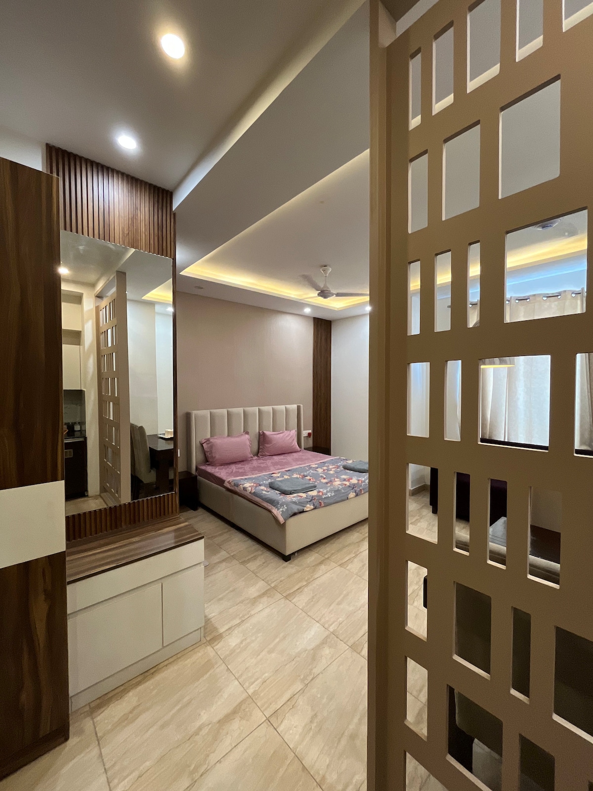 Welcome to your home away from home ! Whether you’re visiting for work or leisure, this bright and stylish space is perfect for couples or solo travellers , families . 🛏 What You’ll Get: • 1 bedroom with comfortable bed & living room • 1 bathroom with hot water & basic toiletries • Fully equipped kitchen for home-cooked meals • High-speed 🛜 , smart TV ,Refrigerator 🚗 Other Highlights: • Parking / 24x7 Security / Self-check-in / Elevator / Pet-friendly • 24x7 💡 Backup