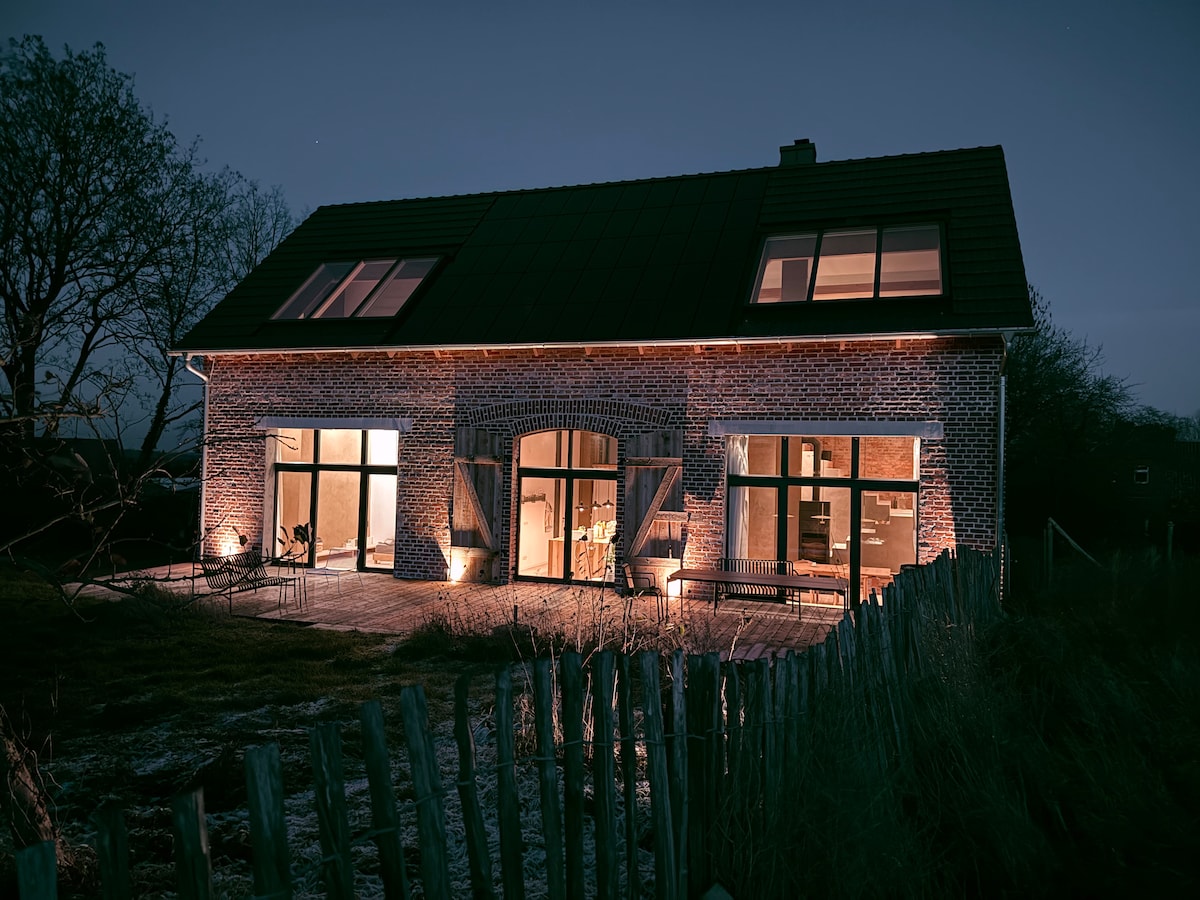 A historic barn reimagined with natural materials, clay walls, and clean minimalist design. Vast windows frame the rolling Lindetal hills, wild garden, and birds overhead. Light-filled interiors, generous rooms, and a long dining table set the stage for slow evenings with friends. Step onto the terrace for quiet nights under endless stars—modern, sustainable, and fully solar-powered, where nature and architecture meet.