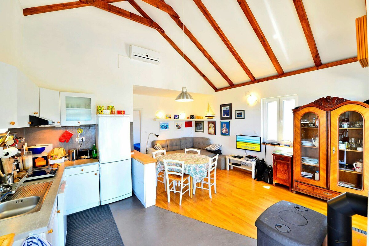 Mala kamena kuća sa pogledom na more, velikom terasom i mjesto za parkiranje. Unutarnji prostor se sastoji od galerije sa dva kreveta . U donjem dijelu nalazi se otvoreni prostor sa kuhinjom, blagovaonicom dnevni boravak sa velikim kaučom na rasklapanje za dvije osobe i kupaonica sa tuš kabinom. Kuća ima poseban ulaz a odmah pokraj ulaza i svoje parkiralište.