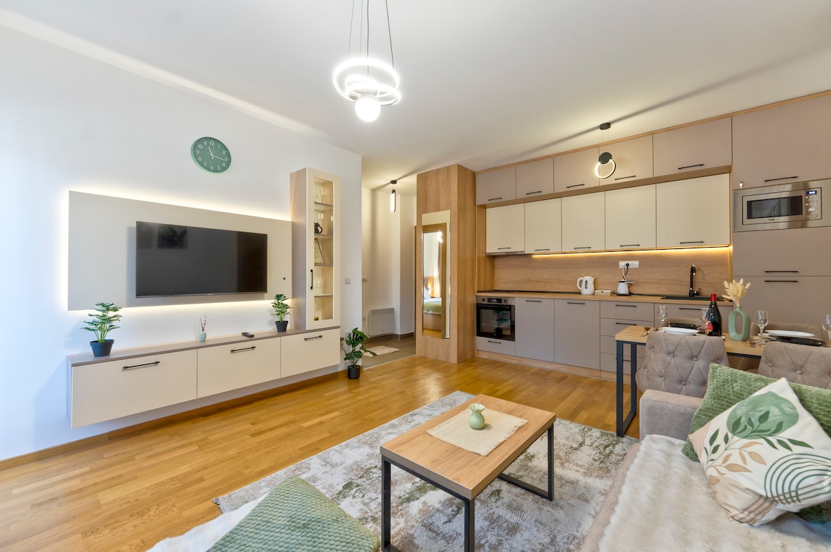 Very peaceful and centrally-located apartment. Very spacious and family friendly oriented. Building is surrounded by tall trees and yet only 100m from Kraljev Trg. 2 bedrooms with lots of space. Netflix and toys for kids. Parking space in the garage included in the price. Gym available for extra charge