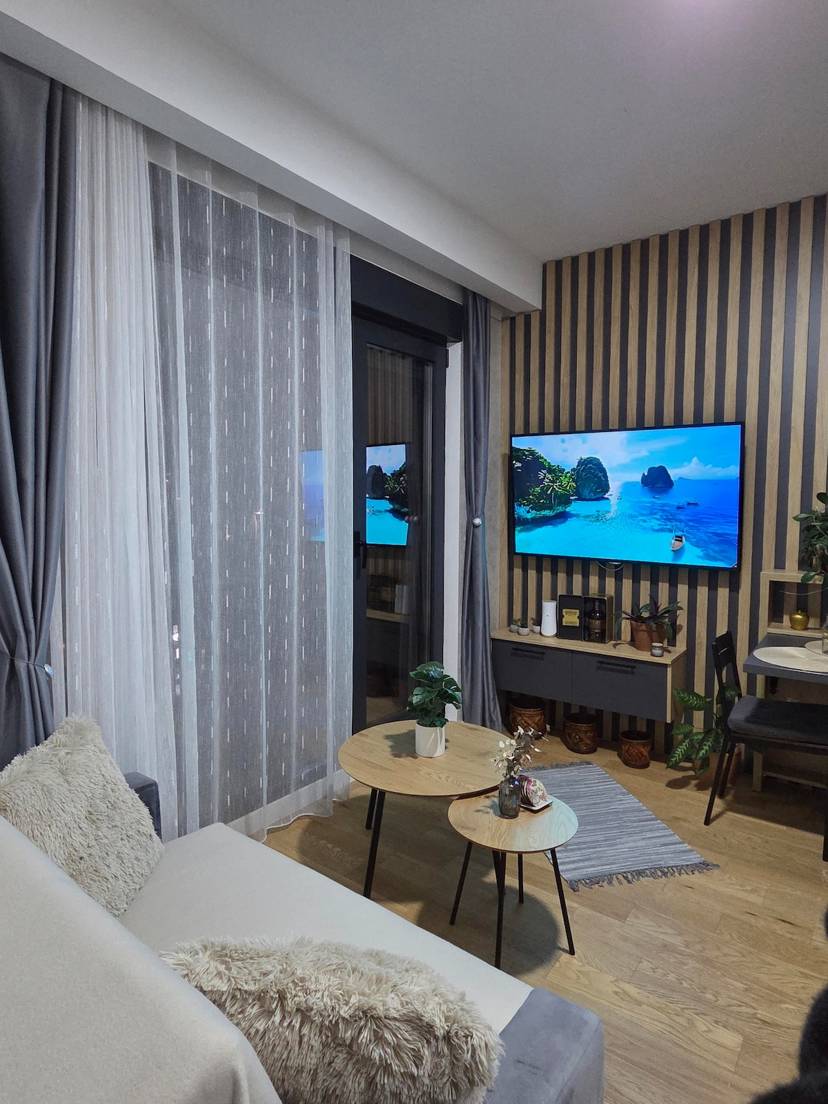 Welcome to our cozy 8th-floor apartment, perfect for up to 4 guests. Enjoy panoramic views from the spacious and beautifully designed terrace. The apartment is bright and inviting, equipped with everything you need for a comfortable stay. Relax in the warmth of underfloor heating in the modern bathroom, stream your favorite shows on Netflix with two TVs, and stay cool with air conditioning.