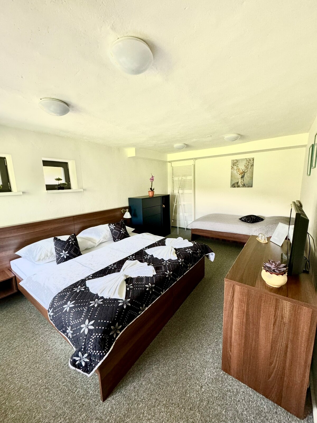 Jednoduchý, ale prostorný pokoj pro tří-členou rodinu, který naleznete v prvním patře penzionu. Pokoj je vybaven vlastní televizí a balkonem situovaným na východ, můžete si užít ranní východ slunce na balkoně, s naší výběrovou kávou a výhledem do malebné přírody. Během Vašeho pobytu Vám bude k dispozici: koupelna se sprchovým koutem, WC, manželská postel s přistýlkou a malá předsíňka. Třílůžkový pokoj je vybaven dostatečně velkou skříní, do které se Vám jistě vejdou veškeré věci a zavazadla.