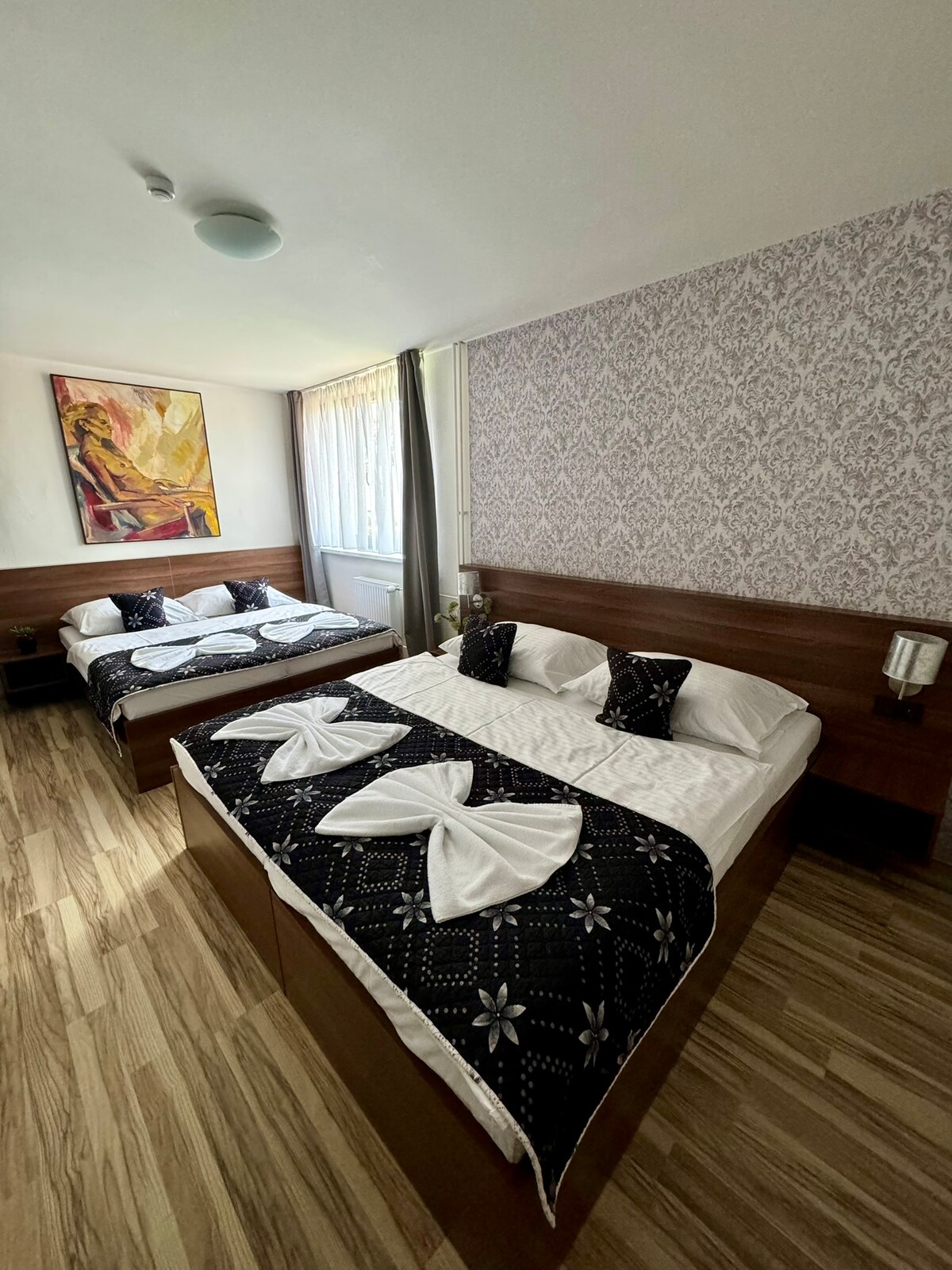 Ideální pokoj pro čtyřčlennou rodinu, v prvním patře rodinného hotelu. Minimalistický, s dostatečně velkým prostorem pro veškerá zavazadla. Pokoje je vybaven: prostornou skříní, televizí a nově zrekonstruovanou koupelnou (sprchový kout) a wc k dispozici je fén. Dvě manželské postele se speciálními matracemi, takže si vychutnáte kromě čerstvého vzduchu v lázních také kvalitní spánek. Televize je samozřejmostí. Možnost doobjednání snídaně.