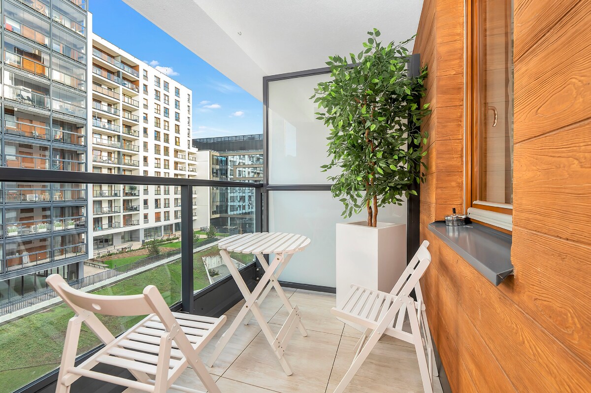 Designed in high standard, fully equipped, cozy apartment in a prestigious quiet district. TV (news in english, french), free fast Wi-Fi, parking place in the garage and a large balcony :) Fully equipped kitchenette. Cafes, restaurants, 24/7 gym and supermarket nearby. Perfect for couples, families with children or business travelers. Feel like you're at home :) <2 km to: TVN, SGGW, Medicover hospital, Dr Szczyt Clinic. ~5km to Mokotow Business Park.