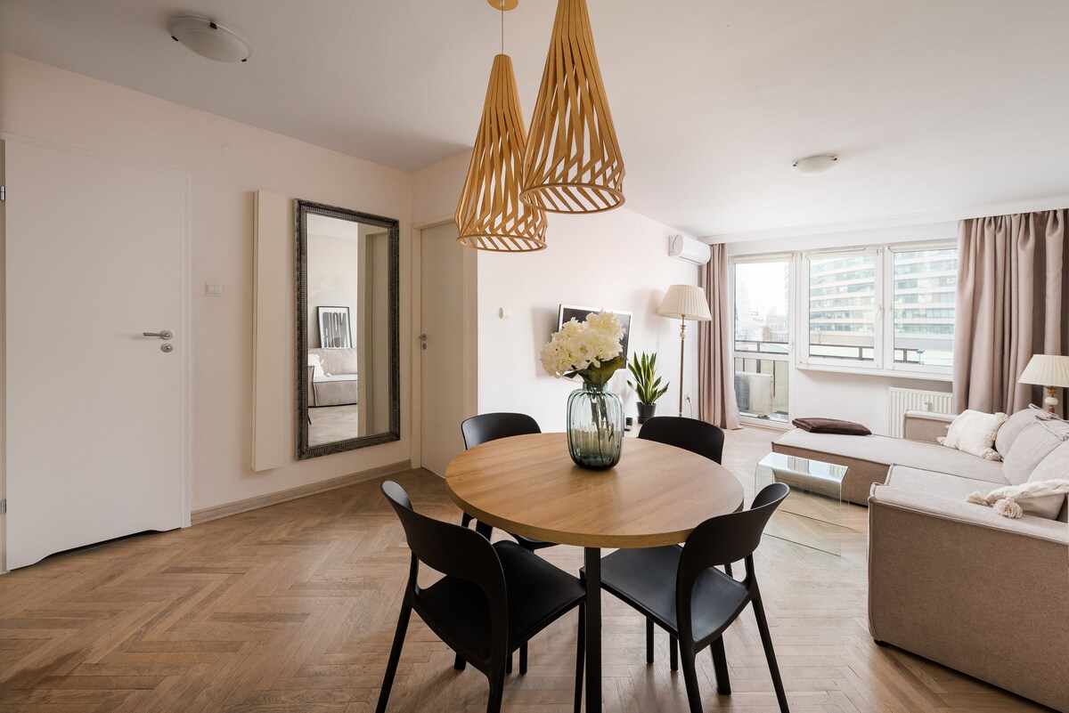 Spacious, bright two-room apartment after renovation in the heart of the city. The apartment is located on the second floor of a building with elevator. From the windows there is an extraordinary view of the Palace of Culture and Science. The building is located 5 minutes from Central Station. Contemporary interior design with vintage elements create a unique ambience ideal for a holiday or a business trip.