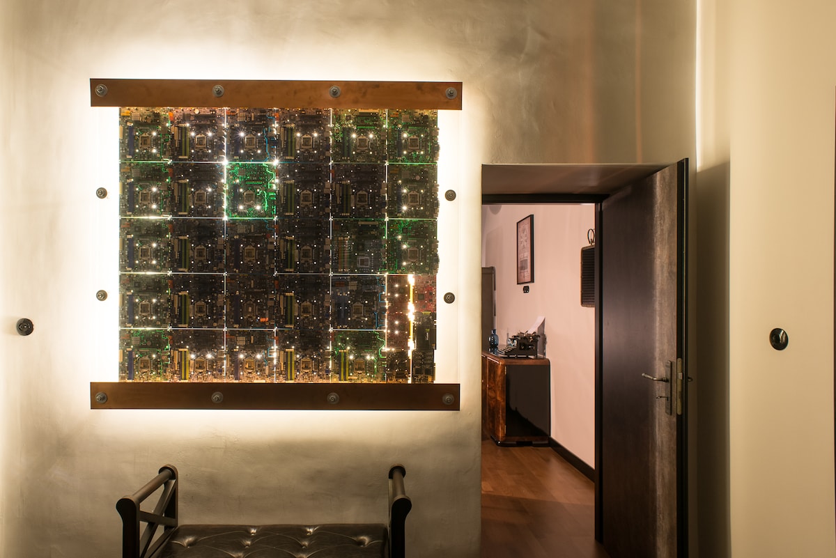 The Nikola Tesla is a unique place, created with passion and attention to detail. Some of the equipment has its history (toaster, Czech Tesla radio, air ionizer, bakelite objects and electrical equipment), but they are also created by owning the owner to old and timeless appliances (decoration of computer motherboards, lamp clock, and other). Tesla patents hang all over the walls, and the whole apartment is quiet and cozy. Background music from Bose sound system.