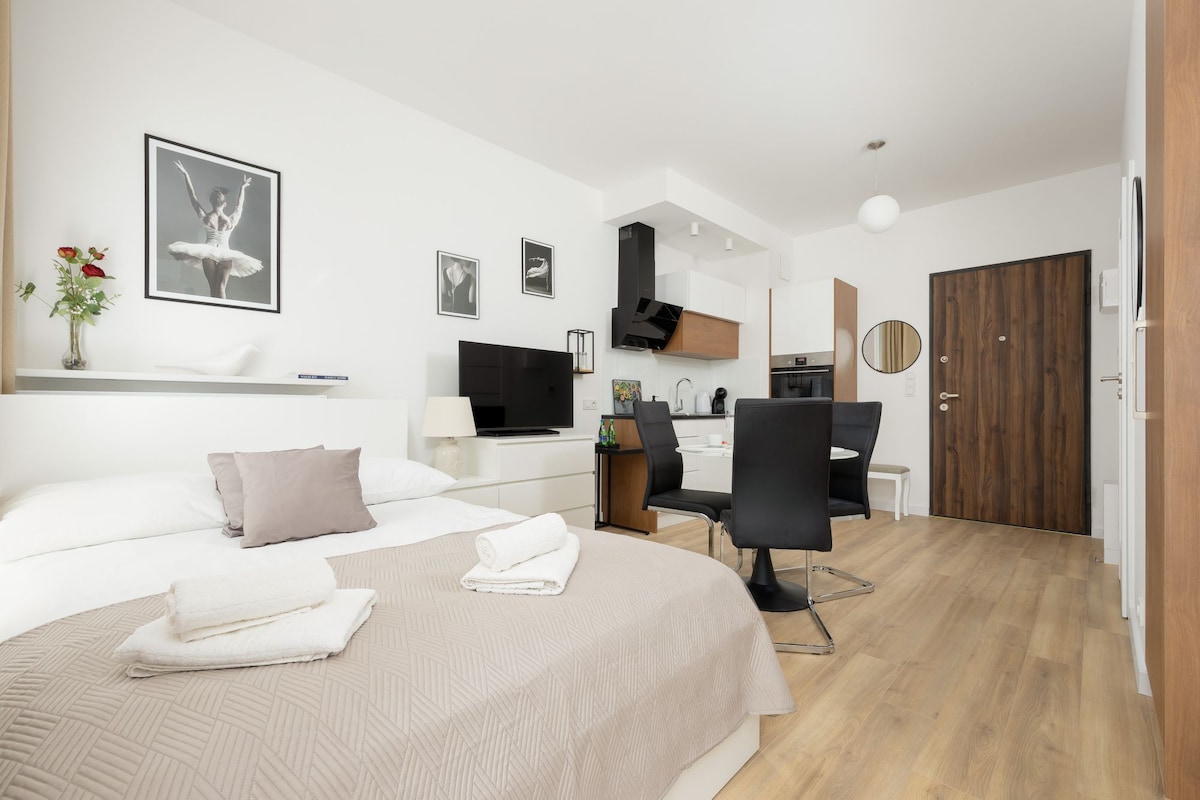🌃 28th Floor Panoramic City Views 🎟️ 50% Off Monthly Stays (30+ Days) 🅿️ Free Underground Parking ⚡️ Dual High-Speed Internet 🔑 24/7 Security Guards & Self Check-in The apartment is located in a modern building, walking distance from the Palace of Culture. The size is 70sqm, has 1 bedroom and a spacious living room. It is close to the important points: 15-min walk to Złote Tarasy Mall and 8-min ride to the Old Town. Few steps away from the newest trendy dining complex: Fabryka Norblina.
