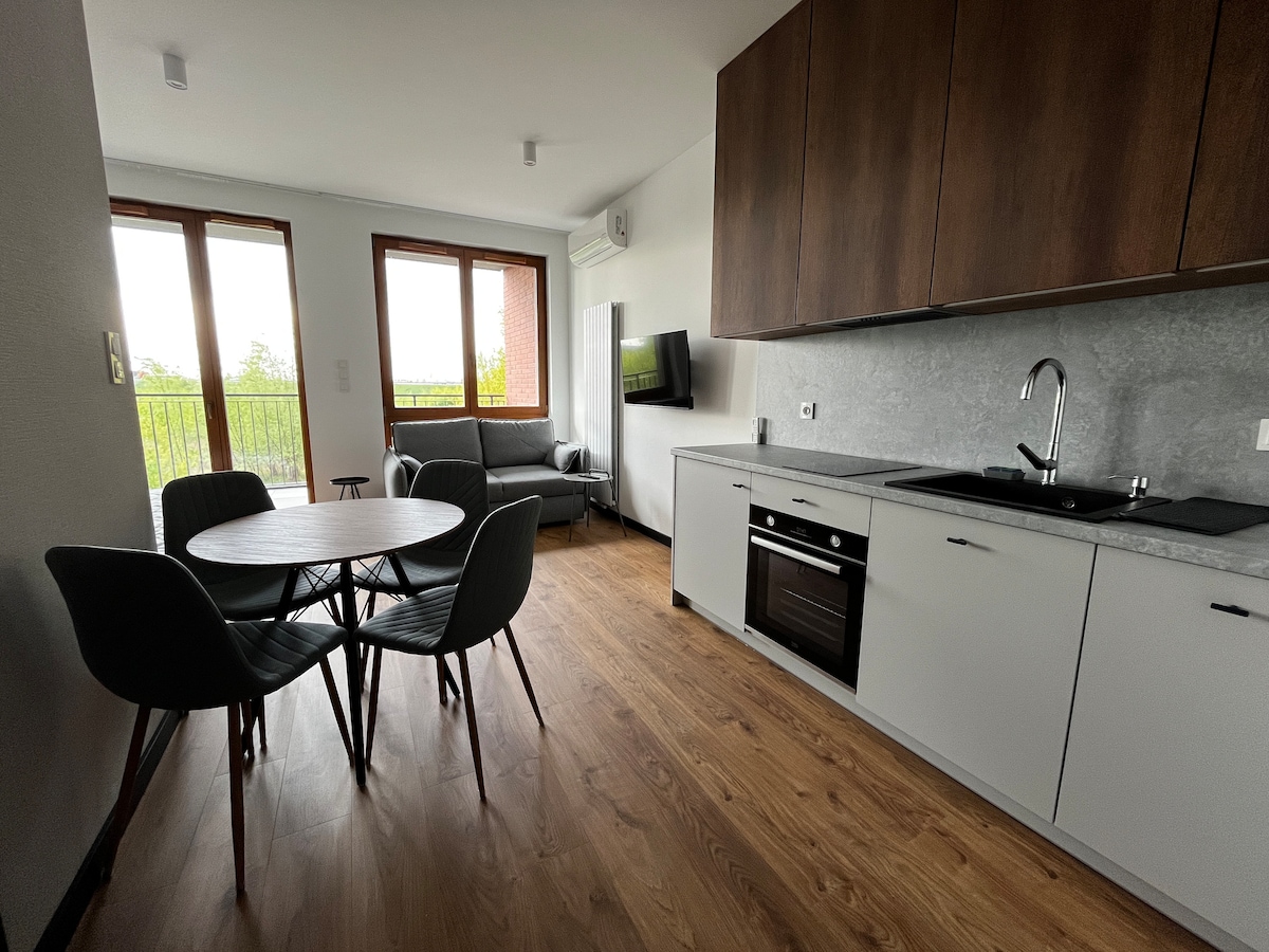 Superior Hotel 4**** Suite standard. Air Conditioned. 24h Reception & Guards! Great location in Central District with a stop of Train Airport-Downtown! Grocery shop & cafe 6-23 next to gate! Bus 100m. Modern, cozy&quiet, fully equipped. Air conditioning. Washer & separate Tumble Dryer! Own, guarded parking 10m from the door! 3 beds up to 6 pax: 2x2 in living room and 1x2 in separate bedroom. TVHD & WiFi 300Mbs! Beautiful park with lakes, pool, gym, playgrounds, rollercoaster, restaurants