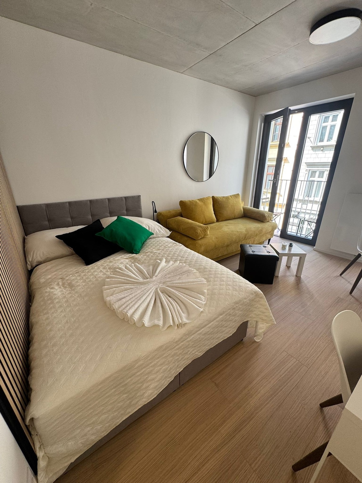 ☕ Modern apartment in Brno with private balcony, cozy bathtub, access to a gym, and a café & bakery right downstairs. Paid parking available on-site 🚗. Perfect for couples, solo travelers or business trips. Quiet Brno-central location, just minutes from the city center. Ideal place to relax, explore and enjoy your stay 🌿