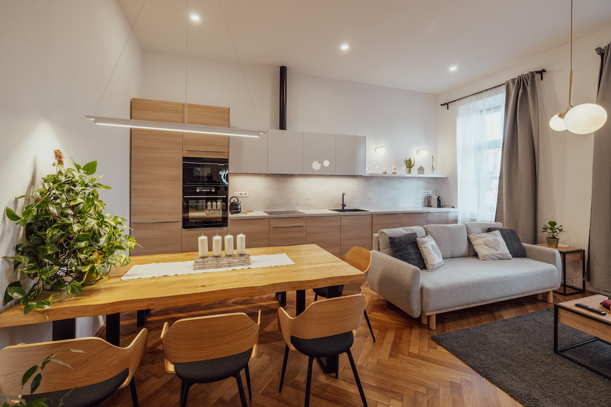Vybavený apartmán 2+KK u Louckého kláštera ve Znojmě, v blízké vzdálenosti pěšky od supermarketu a autobusové zastávky, centra města s restauracemi a historickými památkami (10 min), cesta k řece (5 min). Výhled na centrum města. Byt je zrenovovaný a moderně zařízený. Je zde základní vybavení, klimatizace, wifi připojení, TV, pračka se sušičkou, fén, myčka na nádobí, kávovar a veškeré kuchyň. potřeby. Možnost uzamčení kol ve sklepní kóji. Parkování možné zdarma na veřejném parkovišti před domem.