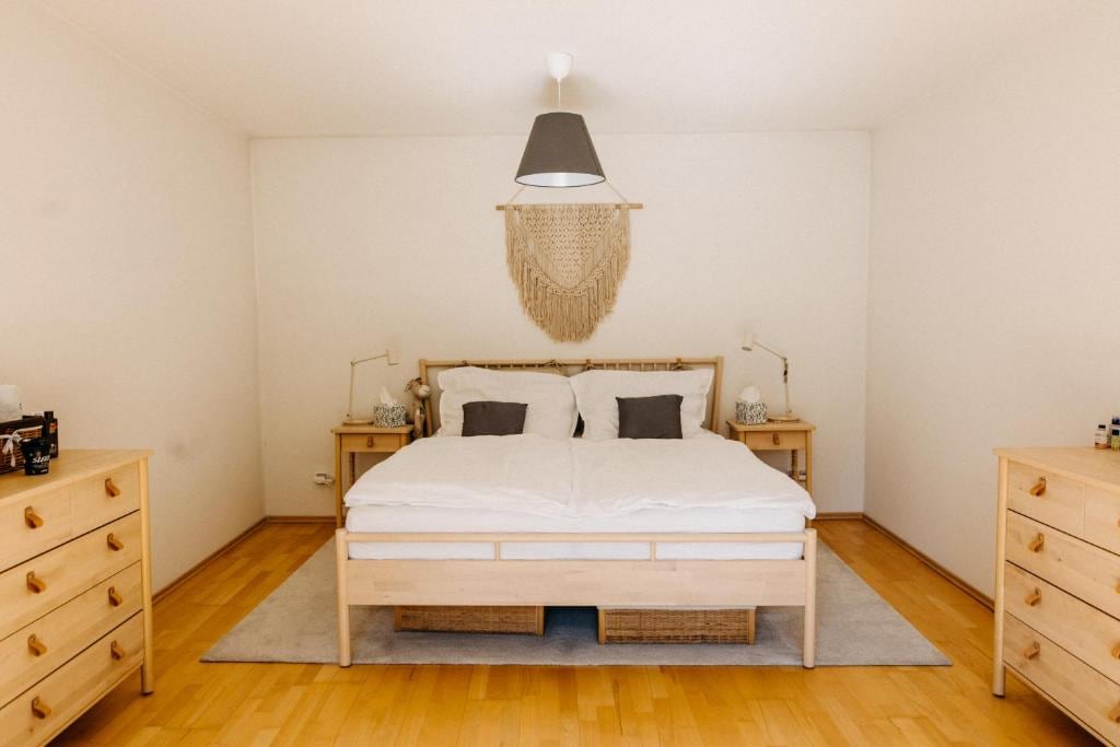 Welcome to our Modern apartment in Znojmo. From the 6th floor, you'll enjoy a beautiful view of the city. 52m² apartment has two rooms: living room with TV, desk, and pull-out sofa (190x120), and separate bedroom with bed (200x180). Kitchen is equipped with built-in appliances, cookware, bar, and coffee machine. There's bathroom with shower and separate WC. Bedroom is air-conditioned, and living room has ventilation. Trip tips: Znojmo's historic center, Vranov nad Dyjí, NP Thaya.