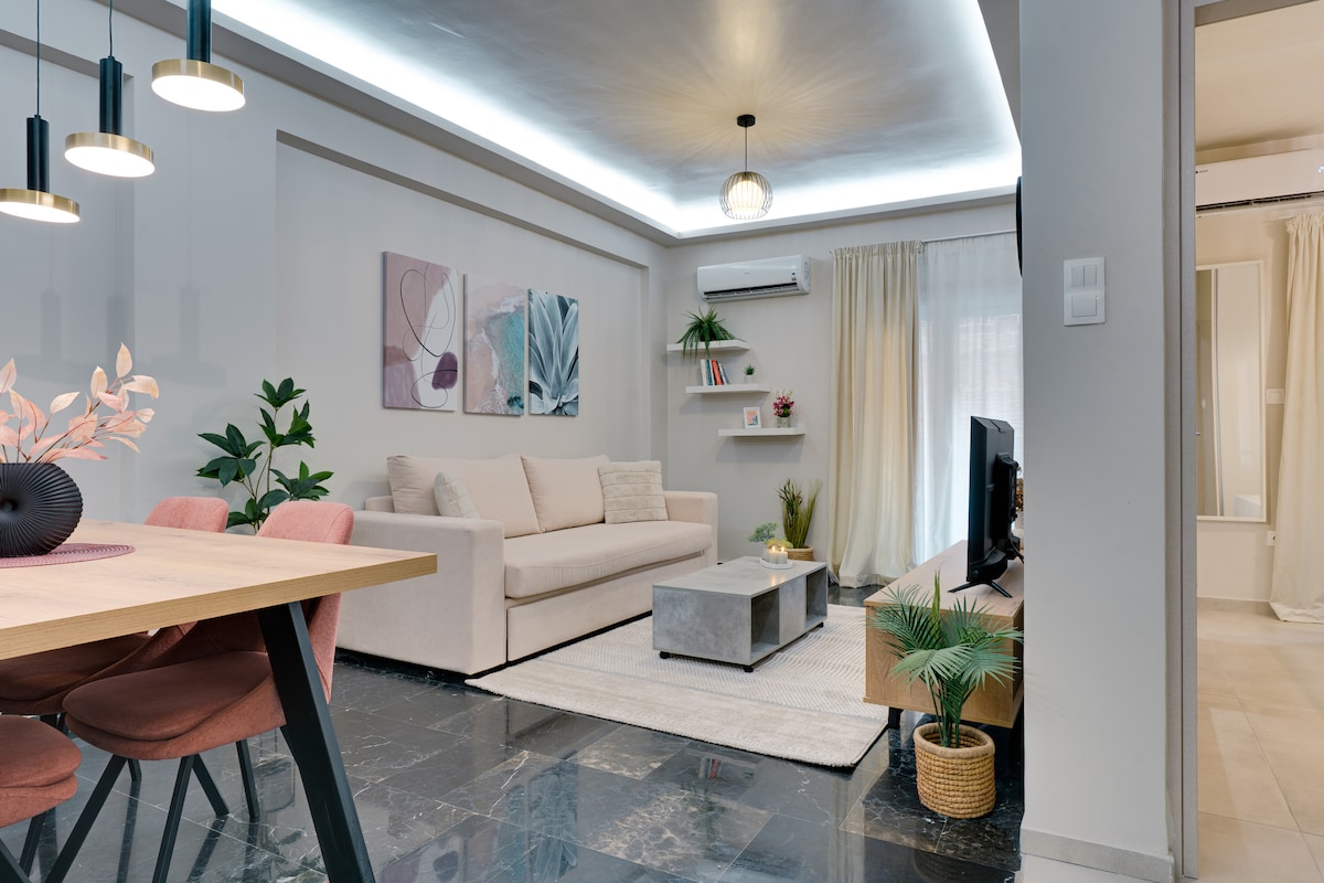 A newly renovated apartment conveniently located in the heart of Athens. Inspired by a love for Mid Century Design, every detail in this home has been carefully selected to provide a retro look with all the modern conveniences. Only a 3 minute walk to the nearest metro station and 4 stops away from Monastiraki Sq, you'll have easy access to all the must-see attractions of Athens.