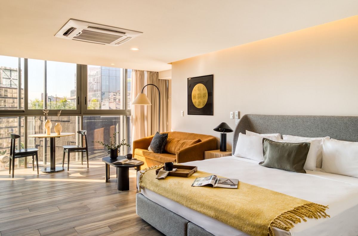 Welcome to your practical and cozy space in Mexico City! Discover our Studio at NIU Reforma, designed to combine comfort, functionality, and style. Every morning, enjoy a complimentary continental breakfast on our rooftop as you prepare to explore the city. Staying at NIU Reforma means being just a 5-minute walk from Paseo de la Reforma. The Insurgentes Metrobús and Reforma 222 Mall are just a minute away.