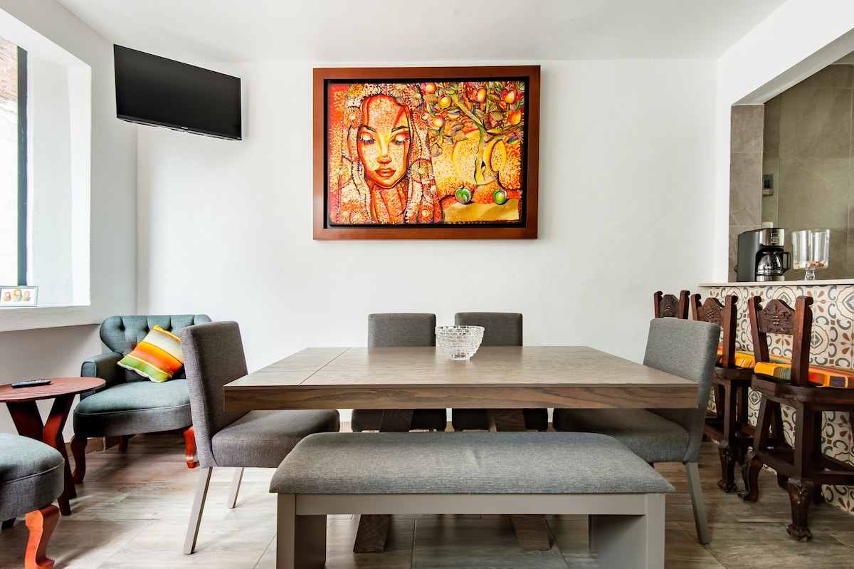 Ubicación inmejorable en el centro histórico de COYOACAN, a 370 metros del jardín Hidalgo, de la Iglesia de San Juan Bautista ( centro de Coyoacán): A 200 metros de la plaza de la Conchita. Cerca de la UNAM y de muchos otros atractivos turísticos y culturales: Muy buenas vías de comunicación y trasporte, es la zona cultural de la Ciudad de México. Zona muy tranquila, apacible y segura a pesar de lo céntrica. Casa típica de Coyoacán por su arquitectura y decoración.
