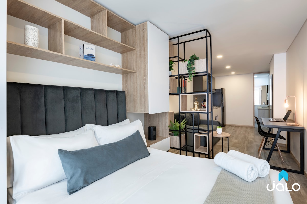 Located in the best area of Bogotá. ideal for business trips, leisure and small families that want to stay in a studio apartment. You will be in walking distance from three main shopping centers, top restaurants, gyms, supermarkets, bars, clubs, parks, coffe shops, hospitals and public trasnport stations in the city. This brand new studio apartament offers 24/7 doorman security a panoramic terrace on the building´s top floor, jacuzzi and front view to one of Bogota´s principal parks, el Virrey