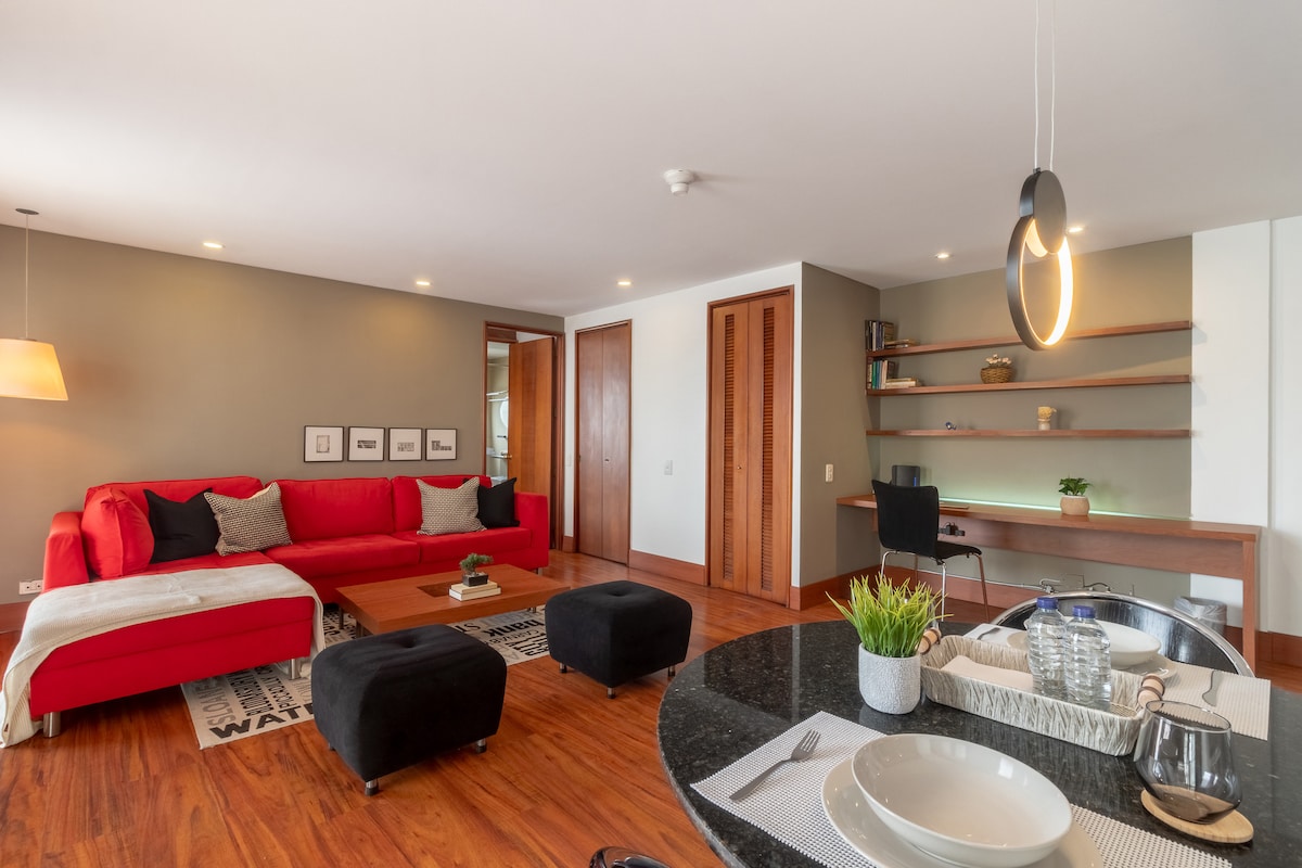 Modern apartment, very bright, with all the amenities so you can enjoy great moments in Bogotá. It is located in the San Patricio neighborhood, on Pepe Sierra Avenue (116th Street), very close to malls such as Unicentro and Hacienda Santa Bárbara, Usaquén, and business centers, clinics (SantaFé Foundation and Reina Sofía Clinic) and surrounded by a commercial area where you will find restaurants and stores for all tastes. It has Netflix/HBO, HighSpeed Internet, Printer, Water filter, Gym & more.
