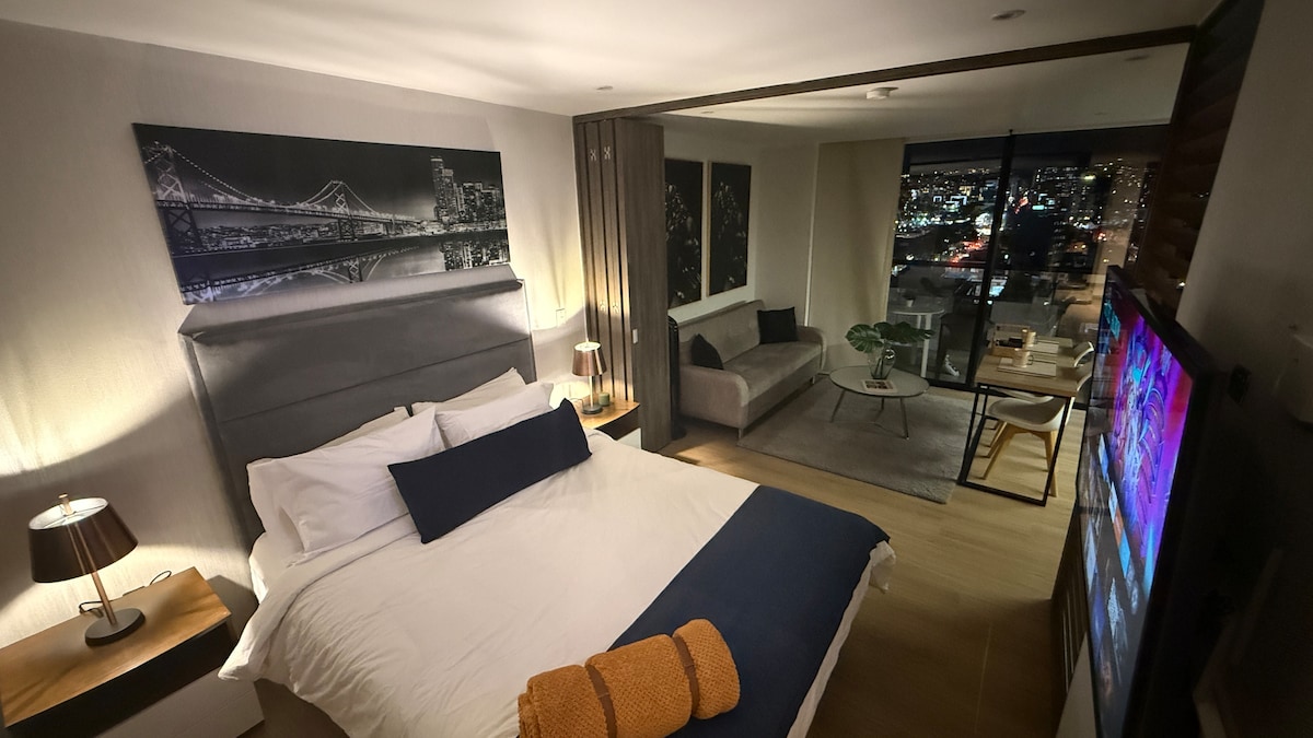Welcome to this cozy and bright 39 m² apartment, ideal for enjoying the city with comfort, style, and a spectacular view. Designed for both short and long stays, it’s the perfect place for business travelers, couples, or digital nomads seeking peace and connection in the heart of Bogotá. The loft features a queen-size bed for two guests and a sofa bed perfect for one adult or two small children. The loft includes parking