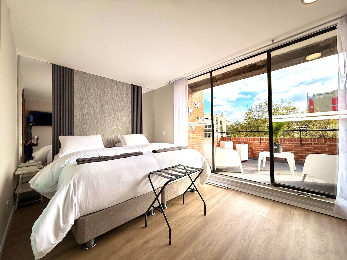 Located in one of the best neighborhoods of Bogota, with a strategic location, which will allow you to move quickly to the different places that this city has to offer you and providing the perfect space for an amazing indoor experience with a spacious and modern terrance with jacuzzi. You will be walking distance from restaurants, top gyms, supermarkets and clinics - Jacuzzi on terrace private - 1 bed room with queen size - Sofa bed queen size - 1 bathroom - washer dryer - parking .