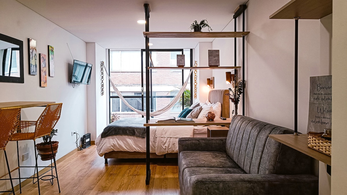 Este hermoso y acogedor loft cuenta con un balcón para disfrutar de la vista, hamaca para relajarse y una cómoda cama para descansar. La cocina está bien equipada. Hay una gran variedad de restaurantes y bares para disfrutar de la escena gastronómica y la vida nocturna de Bogotá. Además, el baño está completamente dotado para asegurar una estancia completamente cómoda !Te esperamos!