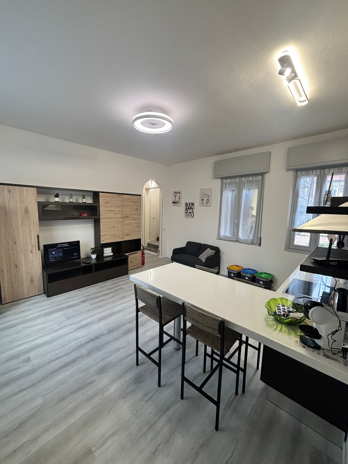 Bilocale biesposto all'ultimo piano. Sala con cucina a vista totalmente attrezzata con grande frigorifero, lavello doppio con tagliere, 4 fuochi a gas, forno e lavastoviglie. Dalla sala si accede al balcone tramite portafinestra con zanzariera. Aria condizionata. Grande e luminosa camera con letto matrimoniale, armadio, comò e comodino, scrivania per smart working vicino all'ampia finestra con zanzariera. Grande bagno finestrato con wc, bidet e doccia con due lavandini e zona lavanderia.