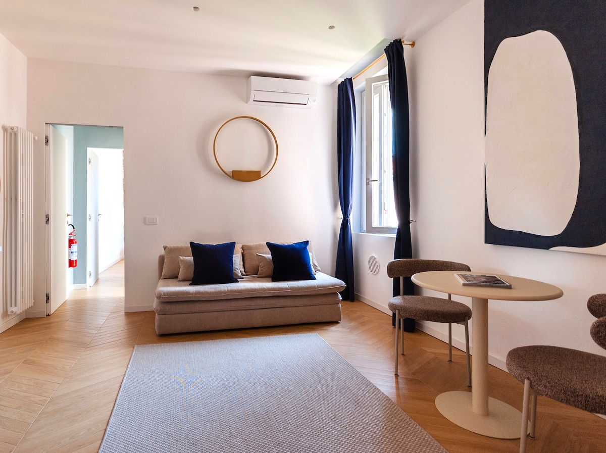 Wake up to the morning light in a historic building in Piazza Giovine Italia. High ceilings create a sense of space, while the living room, with wood paneling and a panoramic balcony, invites you to relax. The modern kitchen and dining area are perfect for intimate dinners, while the bedroom and spacious bathroom offer a serene retreat. A charming oasis where history and comfort meet, for an unforgettable stay.