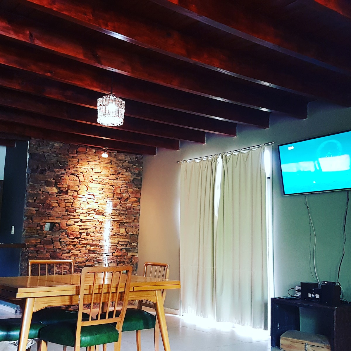 Galeria techada con parrillero y barra. En la sala de estar se encuentran dos sillones camas con dos camas marineras, Lcd con direct tv y estufa a leña. Cocina con barra desayunadora ( hornito elect, anafe elect, pava elect, tostadora, cafetera y heladera), vajilla. Dormitorio con amplio ventanal y piso flotante, Lcd, a/a frio calor. Moderno baño. Nuestra casa es de estilo rustico - moderno y esta totalmente equipada y acondicionada para disfrutar una hermosa estadia de relax.