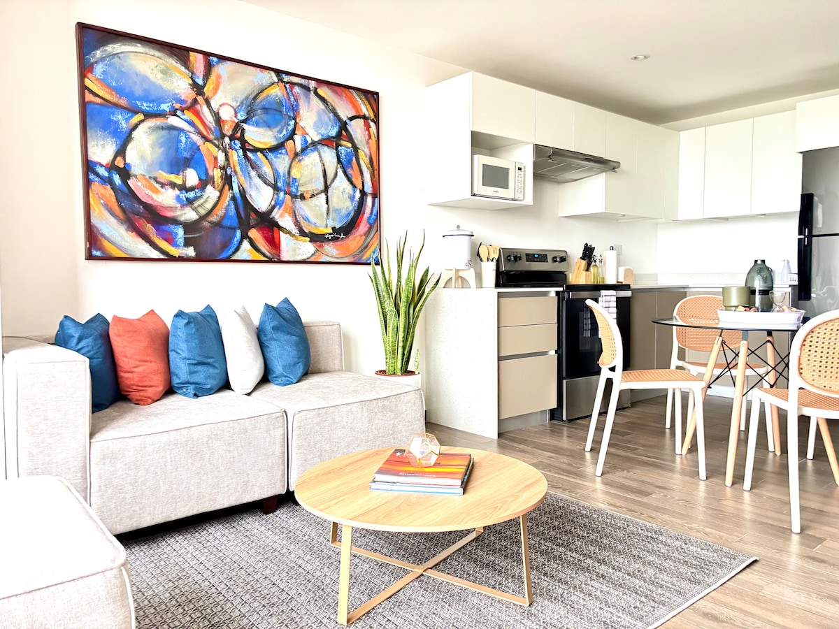 Este apartamento con estilo ecléctico en edificio Quo incluye una cama King, sala, cocina equipada, baño completo, desayunador, balcón, sábanas, toallas, TV, Alexa en áreas comunes y parqueo. Entre las amenidades el edifico cuenta con comercio en el primer nivel, entre ellos varios restaurantes y supermercado, área de recreación, zonas para comer al aire libre, juegos para niños. Todo en un solo lugar.