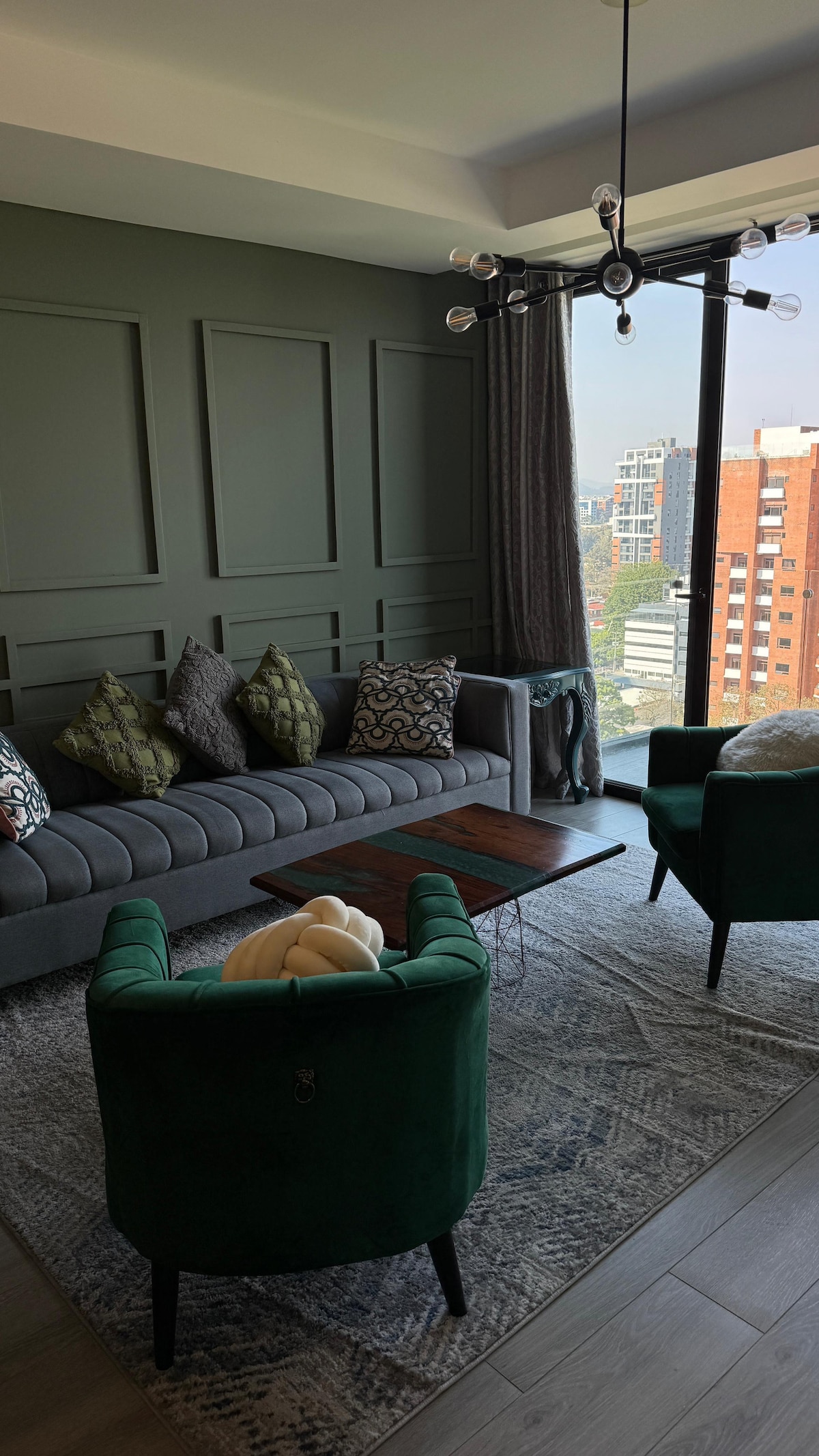 En Zona 10, en plena Zona Viva, dentro de Parque 10. Apartamento para hasta 5 personas, full equipado y diseñado en tonos gris y verde, inspirado en la naturaleza. Cuenta con 2 habitaciones, 1 cama King, 1 cama matrimonial, 1 cama individual y sofá cama. Cocina completa con electrodomésticos, Ecofiltro y básicos. TV en habitación y sala con teatro en casa. Amenidades: piscina, terraza, coworking y ludoteca. Vistas increíbles a los volcanes y check-in accesible.
