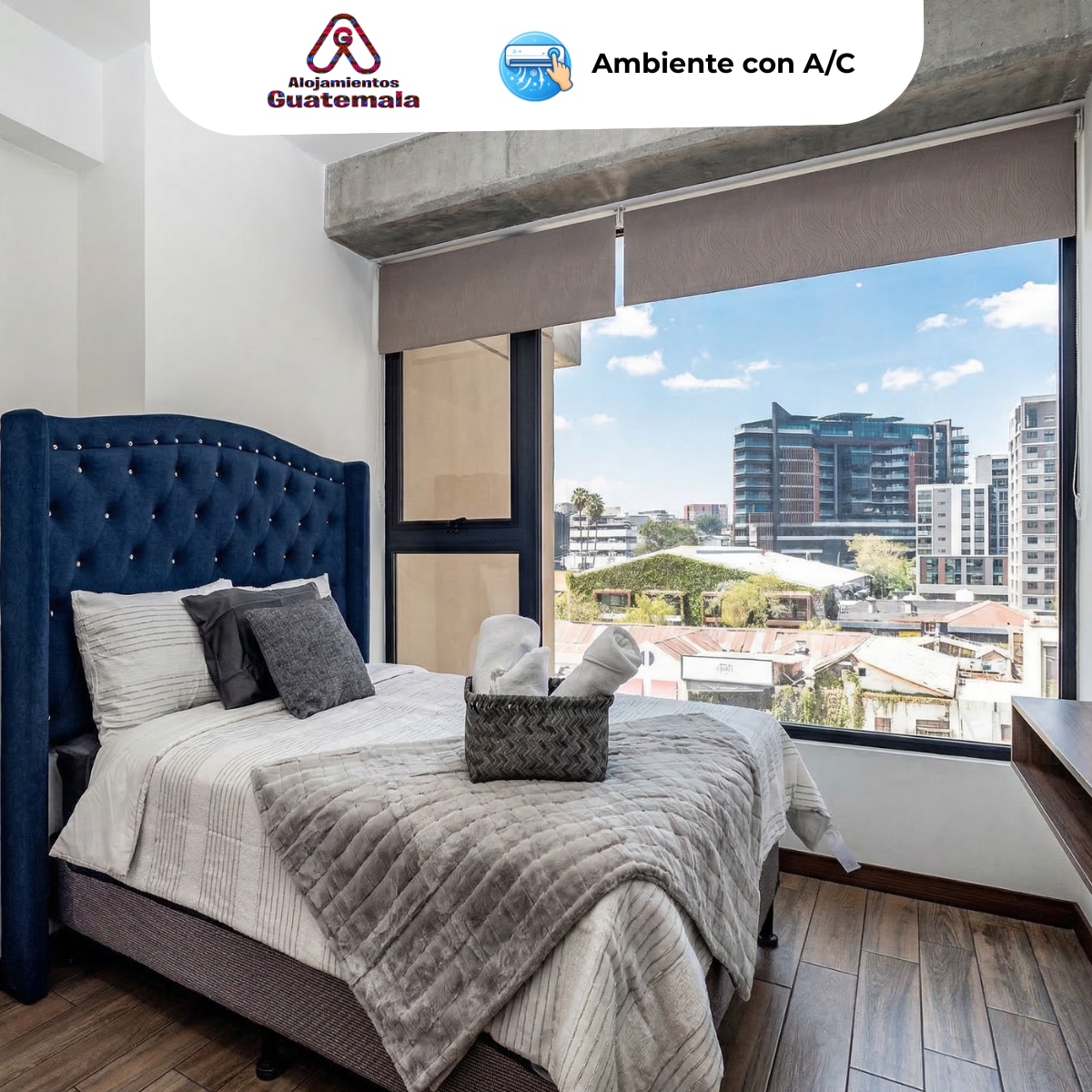 Acogedora suite con estilo en plena zona 10, a pocos pasos de centros comerciales, restaurantes, hospitales, universidades, aeropuerto y los principales edificios corporativos de la ciudad. Suite con una lujosa decoración, balcón, WiFi, Smart TV y baño completo privado, cocina equipada y parqueo seguro en el sótano del edificio. Áreas comunes con piscina, gimnasio, juegos para niños y varias amenidades mas.