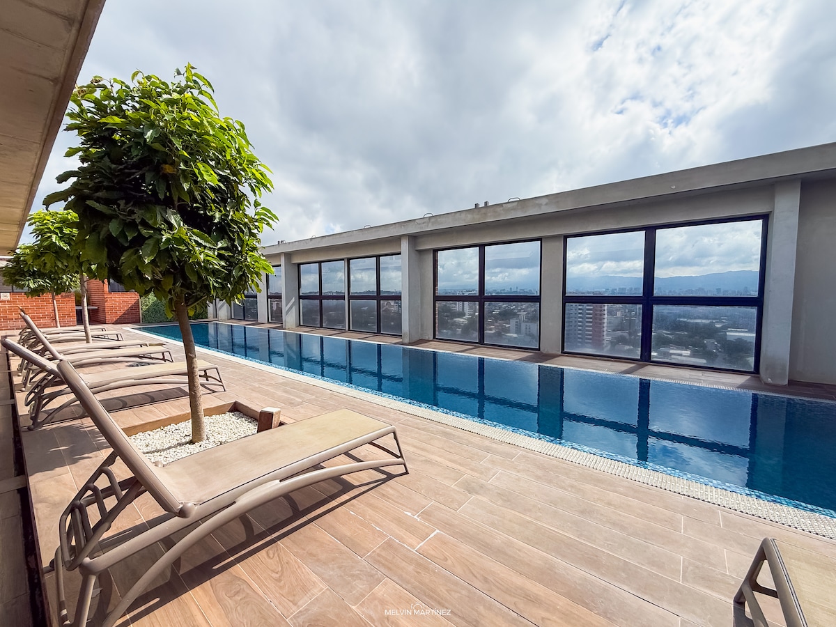 Apartamento modificado de 2 a 1 habitación para ofrecer grandes ambientes y una vista estupenda a la ciudad y los volcanes. Sus más de 85 m2 se conjugan con un equipamiento y decoración de primer nivel. Contamos con piscina climatizada a 31 C, gimnasio equipado, areas sociales en el piso 25 como un Fire Pit; asi como supermercado, salon de belleza y banco en el lobby. Ubicado en la zona hotelera de la ciudad o Zona Viva a pasos de los mejores hospitales, restaurantes y centro comerciales