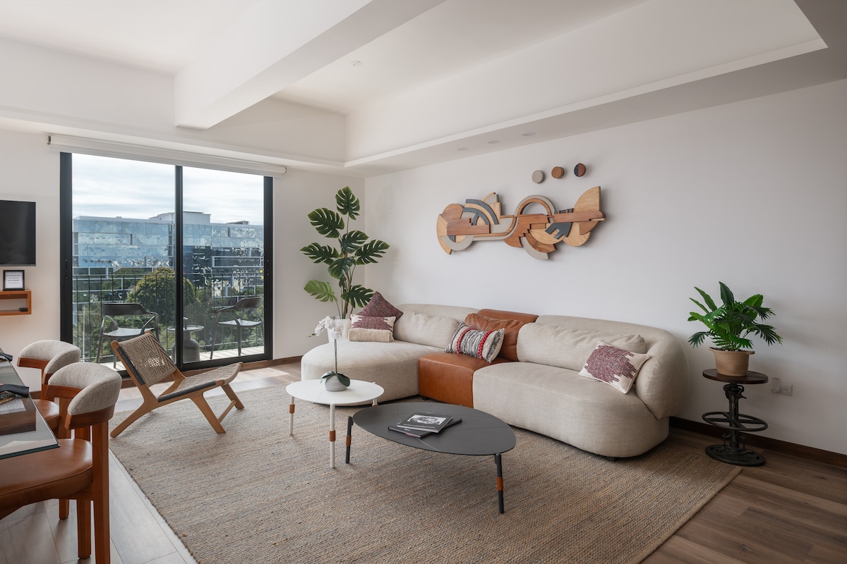 Imagina despertar cada mañana con vistas espectaculares en nuestra suite elegante y lujosa. Ubicada en una zona exclusiva, estarás a solo 10 minutos del aeropuerto. A pasos de tu puerta, encontrarás con restaurantes, salones, tienda y cafés. La suite incluye bicicleta para que puedas dar un paseo. Y cuando quieras relajarte o socializar, disfruta del área social que ofrece entretenimiento y espacios diseñados para compartir momentos inolvidables.