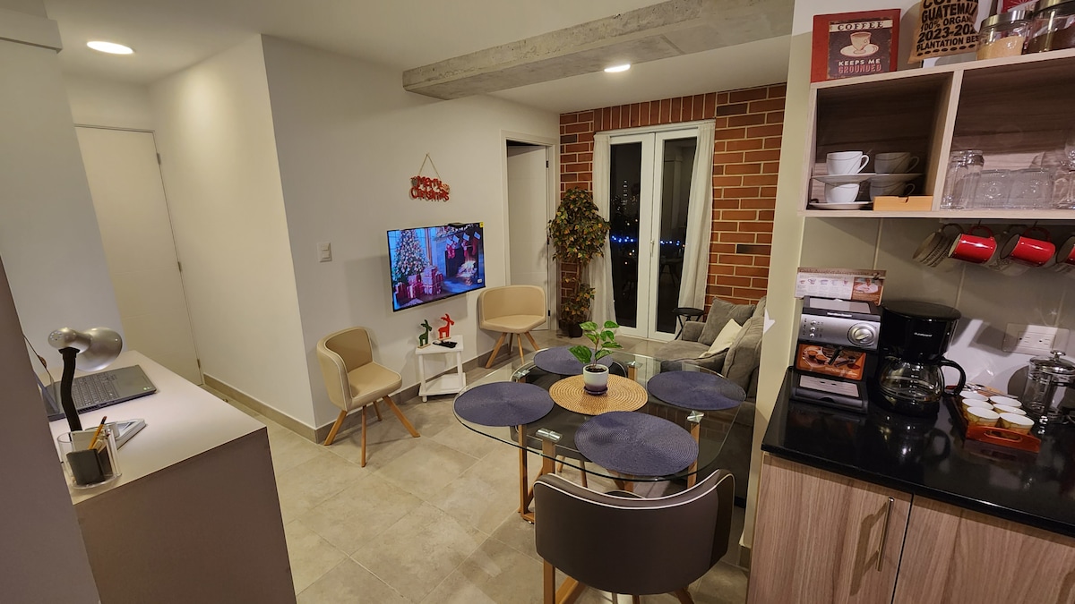 Este apartamento con estilo ecléctico en edificio Quo incluye una cama King, sala, cocina equipada, baño completo, desayunador, balcón, sábanas, toallas, TV, Alexa en áreas comunes y parqueo. Entre las amenidades el edifico cuenta con comercio en el primer nivel, entre ellos varios restaurantes y supermercado, área de recreación, zonas para comer al aire libre, juegos para niños. Todo en un solo lugar.
