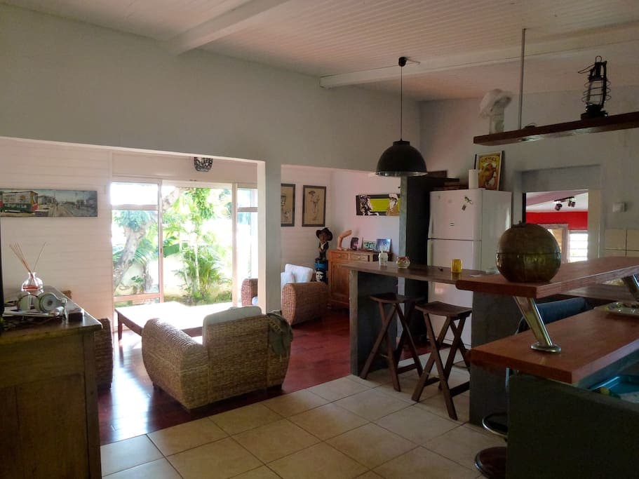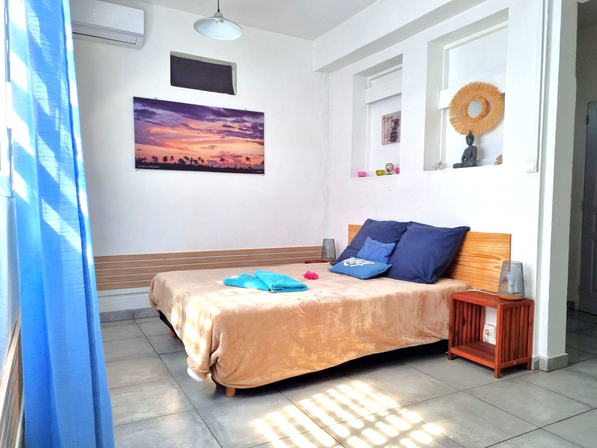 Situé en plein centre ville de Saint Pierre. Appartement bioclimatique dans petite résidence Au coeur du centre ville dans un écrin de verdure Calme assuré Résidence sécurisée Parking privatif 200m de la gare routière , Accès direct vers les cirques de la Réunion. 900m du Lagon. Activé nautique: Kite surf , Kayac de mer... Supermarché à 400 m. Tout peut se faire à pied. Accueil bébé possible matériel disponible avec supplément Lit parapluie ou lit barreaux sur demande avec linge 20 euros sup