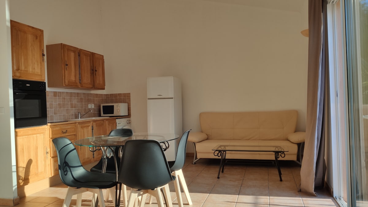 Agréable appartement de 50 m2 en rez de jardin d'une villa, situé au calme à l'entrée de Propriano , à 5mn des plages. Le logement dispose d'une grande pièce de vie avec cuisine américaine toute équipée , un coin repas ,une salle de bains avec douche , wc et bidet. Une chambre accueillant un grand lit (draps et serviettes fournies) . Idéal pour une étape ou un séjour en couple. Il dispose d'une jolie terrasse et d'un jardin. Un parking gratuit est à disposition, ainsi que le wifi .