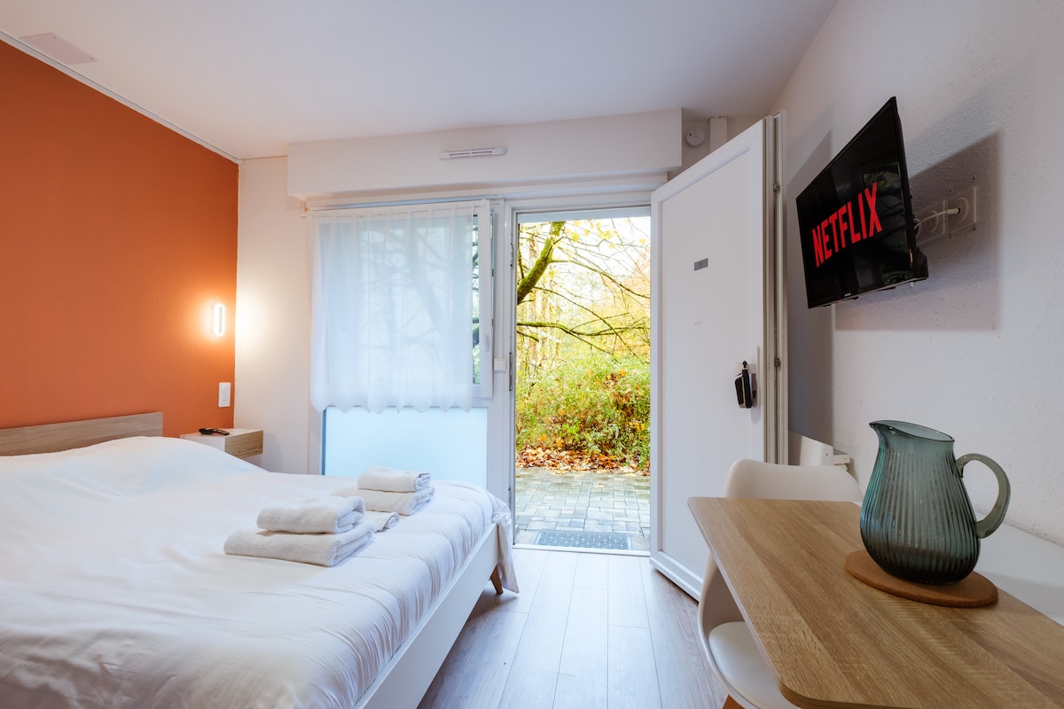✨ Écrin raffiné secret 🤫au cœur d’Amnéville Tourisme ( jacuzzi en supplément et non obligatoire). Offrez-vous une parenthèse de douceur dans ce studio élégant situé dans un endroit calme en totale discrétion Nichée à l’abri des regards, sa terrasse avec spa privé ( option payante)sans vis-à-vis vous invite à savourer le calme en toute intimité. Un parking réservé devant complète ce cocon. Situé au pied du centre thermal : 50 m piste de ski 3 min à pieds galaxie🎶🎼🎵🎤et loisirs.