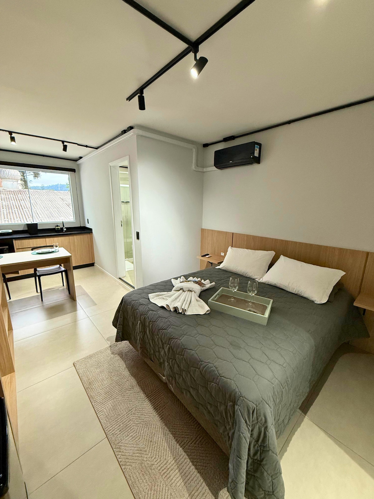 Moderno apartamento studio, localizado à 300mt do parque Vila Germânica - local de eventos como a Oktoberfest. Rodeado por restaurantes, bares, fica próximo ao Parque Ramiro Ruediger, principal área de lazer, caminhadas e exercício de Blumenau. Tudo para o seu conforto: smart Tv 43", ar-condicionado split, wifi fibra 240mb, cozinha completa com geladeira Brastemp, microondas, fogão, cafeteira, forninho, lavação com lava e seca, armário de roupas, e é claro uma cama queen convidativa!