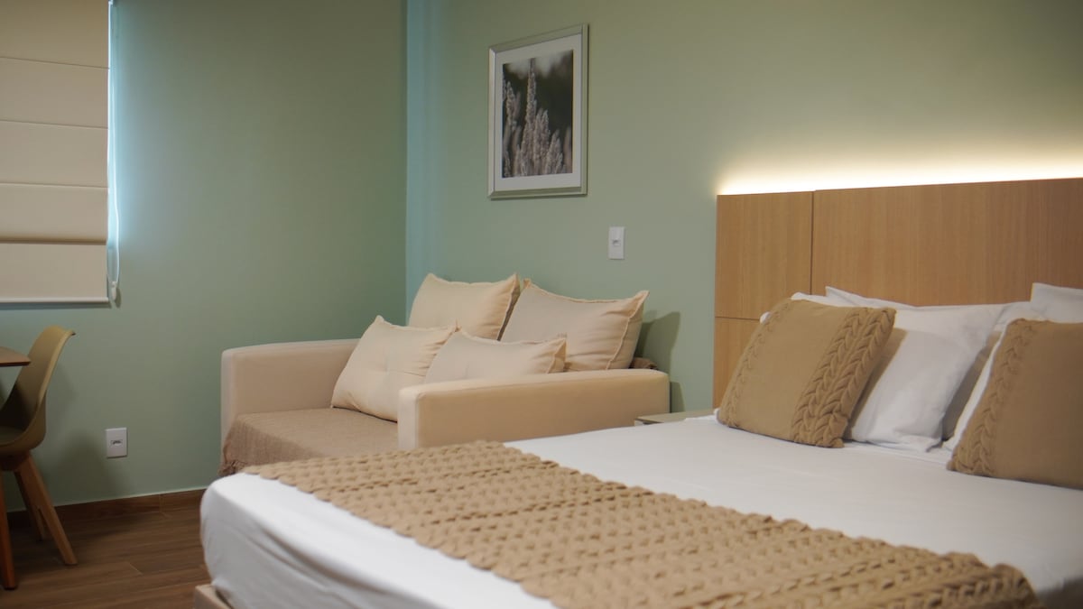 Nosso espaço é ideal para pessoas que buscam um local familiar, tranquilo, aconchegante e com um custo benefício excelente! A pousada possui uma cama box casal padrão extremamente confortável, sendo ortopédica, uma cama box de solteiro e um sofá cama, cozinha completa com utensílios básicos, sofá, televisão com antena local, ar condicionado, garagem privativa com churrasqueira e banheiro. Atenção: todas as nossas tomadas são 220v. Você não vai querer sair desse lugar charmoso e único.