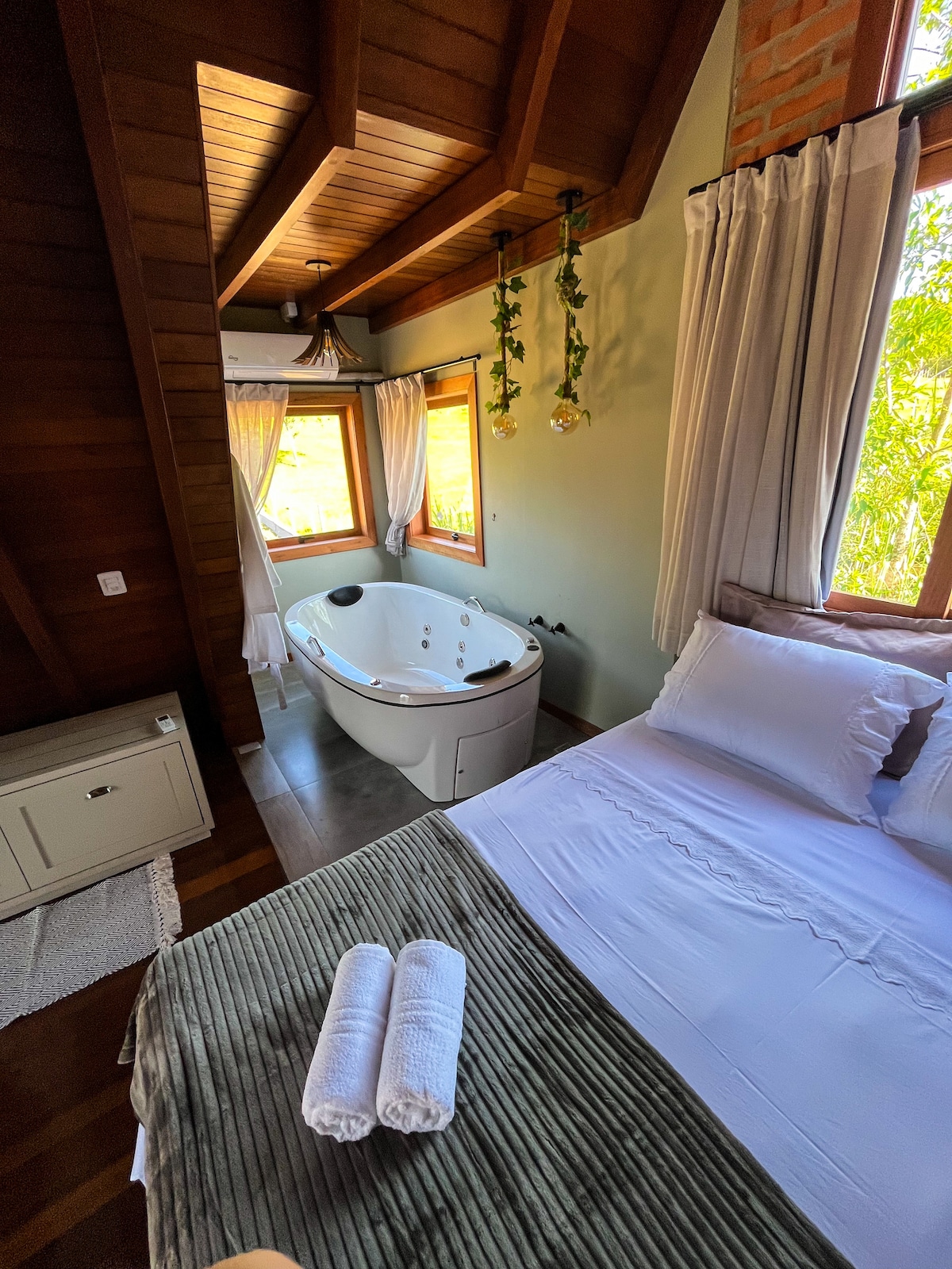 A cabana @oranchodacolina conta com: Cozinha totalmente equipada, micro-ondas, forno elétrico, liquidificador, torradeira e air fryer. Oferecemos tb itens essenciais como sal, açúcar, azeite. A cama queen é super confortável com roupas de cama e banho são de primeira qualidade. Ar condicionado quente e frio, proporcionando conforto térmico em qualquer estação do ano. Banheira de imersão com sais de banho. E no banheiro, chuveiro e torneiras aquecidas a gás com uma linda vista para a natureza.