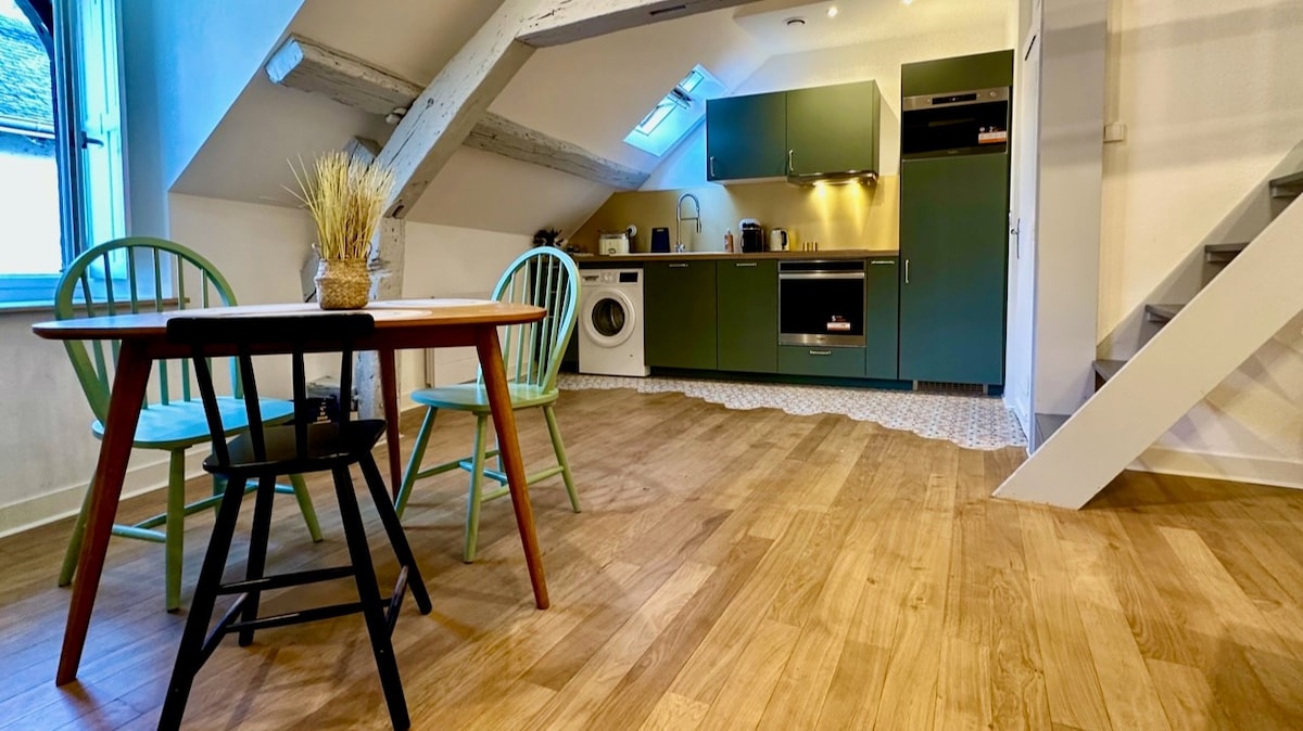 Enjoy an entirely newly refurbished cosy and comfy two-room apartment in a half-timbered building dating back to the 17th century. Located in the historic part of the city of Blois: the St Nicolas area, it will provide you with boh a sense of history and a modern feeling. Known for its picturesque streets and its roman church, the area a nice start to stroll through the royal city.. From there, the château can be reached in a stone's throw and the Loire river flows at the bottom of the street.