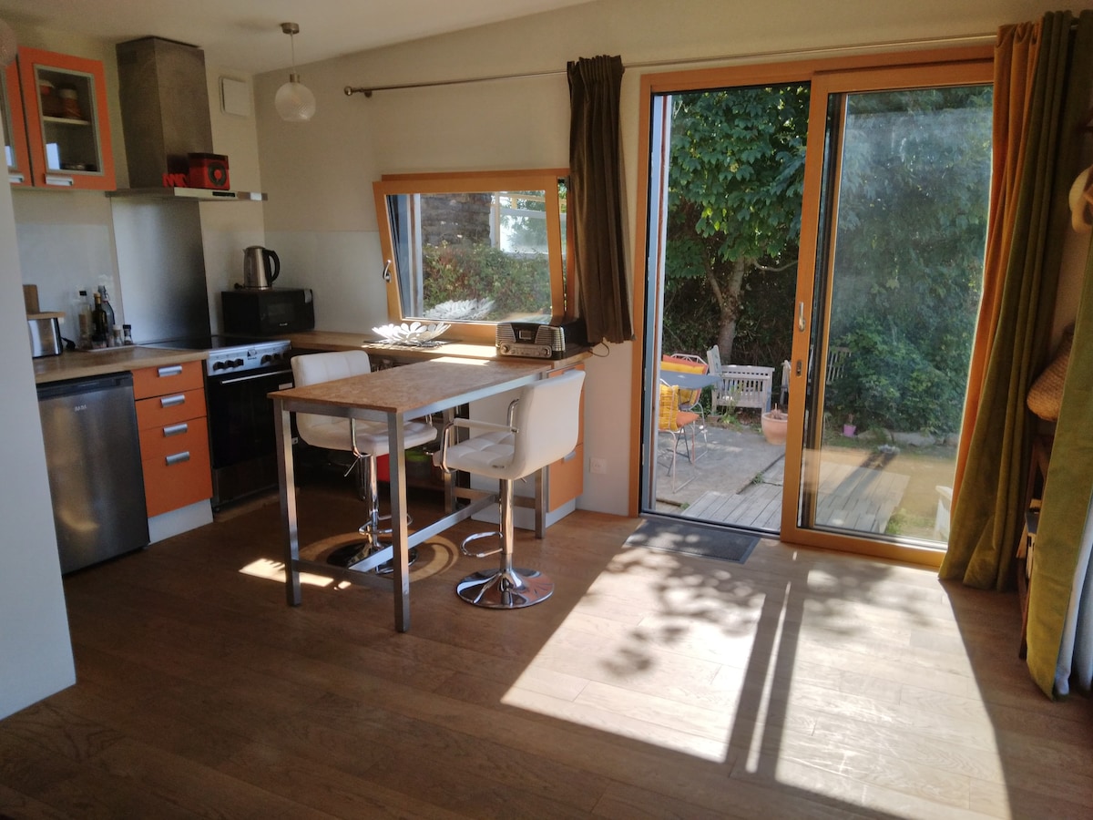 Notre petite maison d'hôtes écologique Le Jardin de Martin à Plérin dans les Côtes d'Armor, calée entre jardin et chevaux est à 5 mn à pieds de Martin plage et du du GR34 et proche des pistes vélo. Pensée comme une tiny house, avec des baies vitrées au sud sur le jardin, aménagée dans un esprit zen et vintage, elle est un lieu atypique, chaleureux, semi-passif, isolé des ondes avec wifi privative. Tout en bois et sérénité. Options bio : petits déjeuners, paniers repas, paniers pique-nique