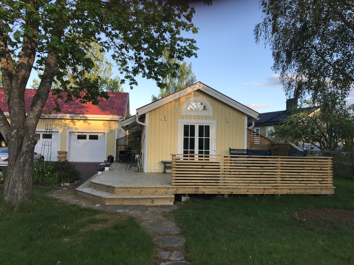 Timmerstuga med uteplats & grill på stor delad tomt i lugn bymiljö. Närhet till natur & bad. Stugan har ett allrum med öppen spis (fri ved), wifi & TV samt en säng (140 cm) & en bäddsoffa (130 cm). Separat kök med spis, mikro & kaffebryggare. Badrum med dusch & förbränningstoalett. Tillgång till bastustuga med relaxrum efter överenskommelse och avgift á 100 kr. Sänglinne & handdukar kan hyras för 150 kr/pers. Slutstädning ingår ej, kan bokas för 500kr. 5 min bilresa till köpcentrum.