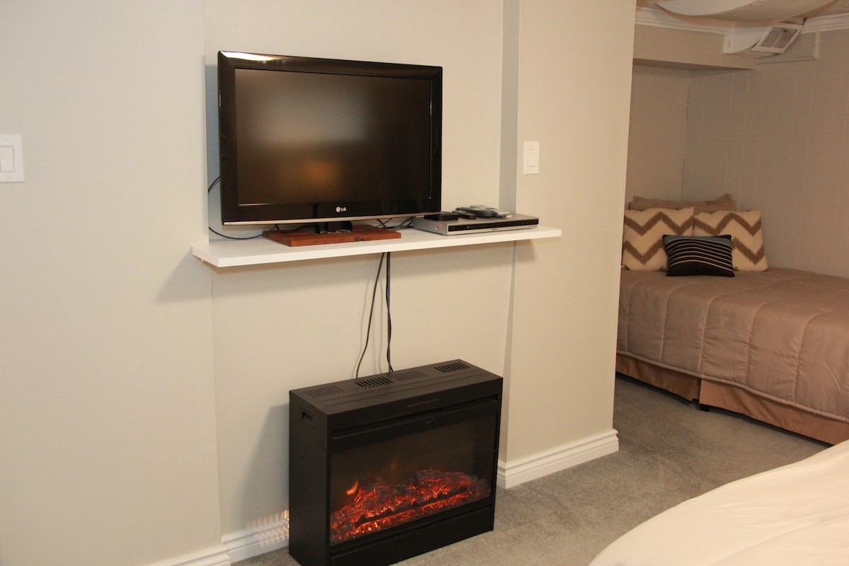 We've recently renovated our basement to create a stylish, modern, cozy and quiet guest suite. There is a side entrance that opens directly onto stairs taking you down to the unit. It has a locking metal exterior door for sound-proofing and security. The unit is a bright studio apartment with three large windows, a full kitchen, sitting area with tv and fireplace, dining table, queen-sized bed, walk-in closet and your own private bathroom with a five-foot shower. With extensive sound-proofing!