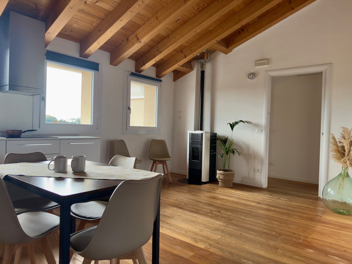 Appartamento con ingresso indipendente, primo piano. Composto da luminoso soggiorno, ampia cucina. Due camere da letto di cui una matrimoniale e una con letto singolo trasformabile in matrimoniale. Bagno con doccia. Arredo nuovo. Una terrazza. Wi-fi (Eolo, 30 mb). Pavimento riscaldato e condizionatore con pompa di calore. Giardino. Parcheggio. Dista cinque minuti in auto dal centro storico di Castelfranco Veneto e venti a piedi. Con il treno si può raggiungere Venezia, Padova e Treviso.