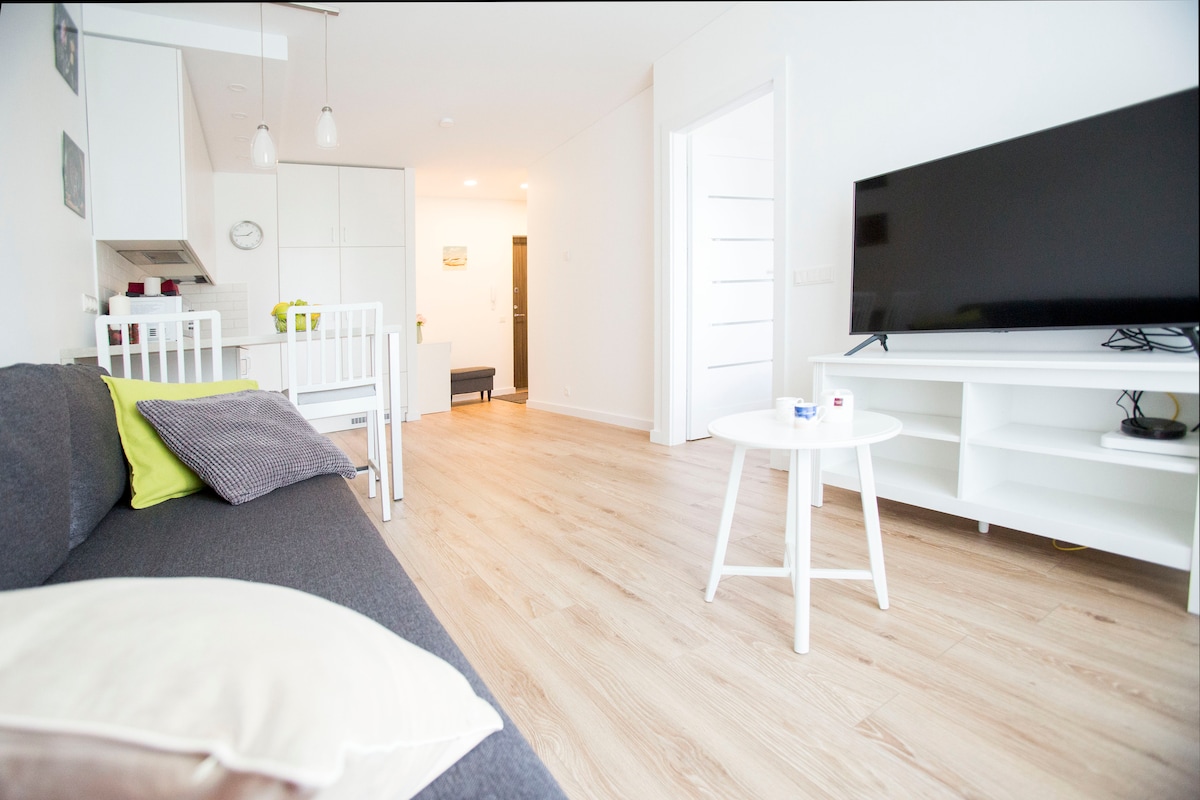 Spacious and bright apartment in the new building has everything for a carefree vacation. There is parking in the yard. Pilaitė is a young district of Vilnius surrounded by lakes and forests. From the apartment to the lake 10 minutes on foot (500 m.) The old city center is 8 km away. Any area of Vilnius can be reached quickly and easily thanks to convenient transport interchange. Staying here, you will get only bright and good impressions.