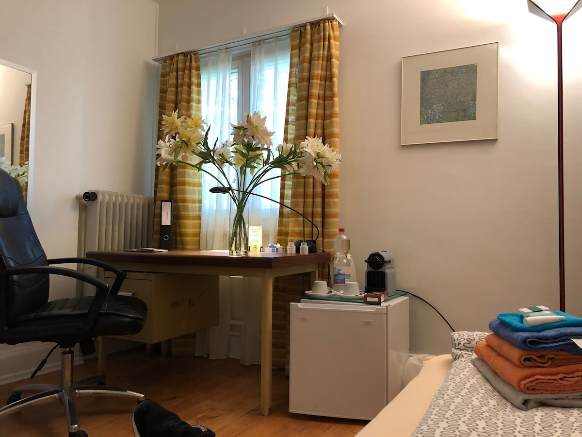 The spacious (25 m2) renovated studio on the third floor has a separate private bathroom across the non-private hallway. It has a kingsize bed, fridge, coffee machine, water kettle and a table to work with high-speed Wifi. In the hallway you will find a little kitchen with microwave, dishwasher, sink, a washer/dryer & a printer/scanner/copy machine. Heating with heat from the earth. We are almost CO2 neutral thanks to our new solar roof.