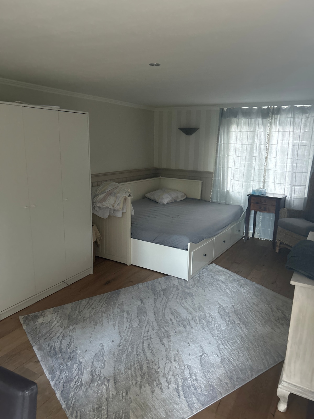 This is a top floor maisonette 2.5 room apartment approx 100 square meters with a bedroom, a fully fitted bathroom, a guest WC, an open plan fully fitted kitchen and a lounge on the first floor via a wooden spiral stair case you will find a single bed and a balcony overlooking the lounge area below. The apartment has a flat TV and stereo system. The apartment has a city view on one side and a garden view on the other with tall lush trees. There is also use of a washing machine and dryer.